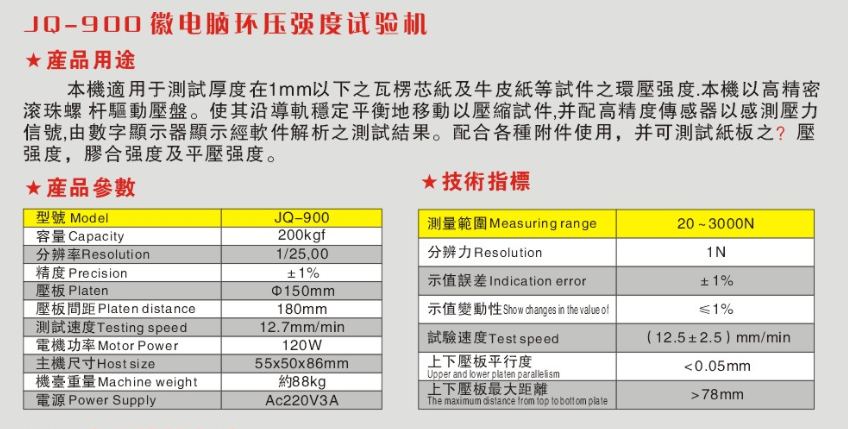 JQ-900 壓縮強度測試儀 紙品類環(huán)壓邊壓測試機 邊壓試驗機產(chǎn)品技術(shù)規(guī)格: