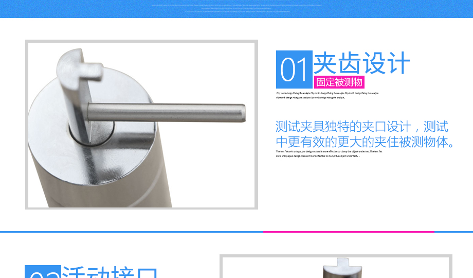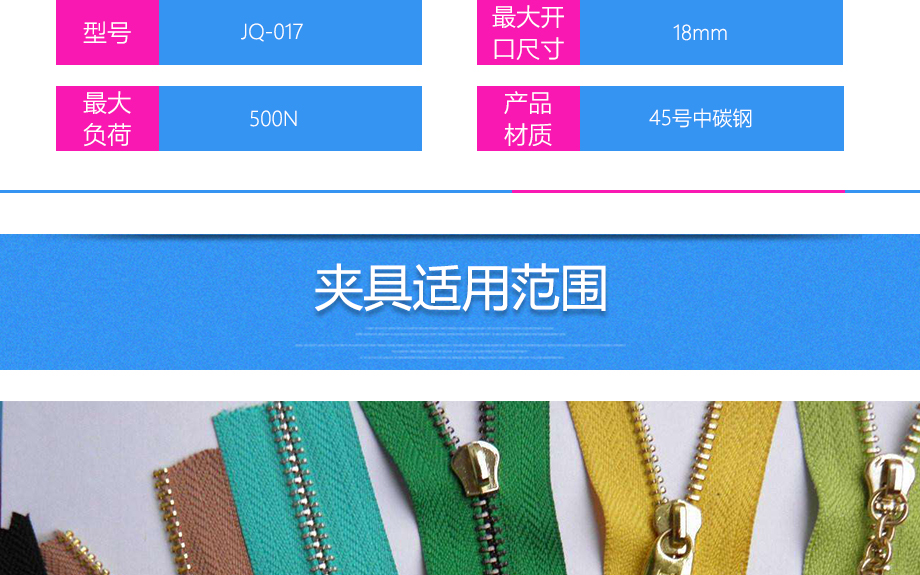 產品型號:JQ-017 品牌:劍 喬 用途:拉鏈夾具適用范圍:拉鏈材料的拉力,破壞力測試。